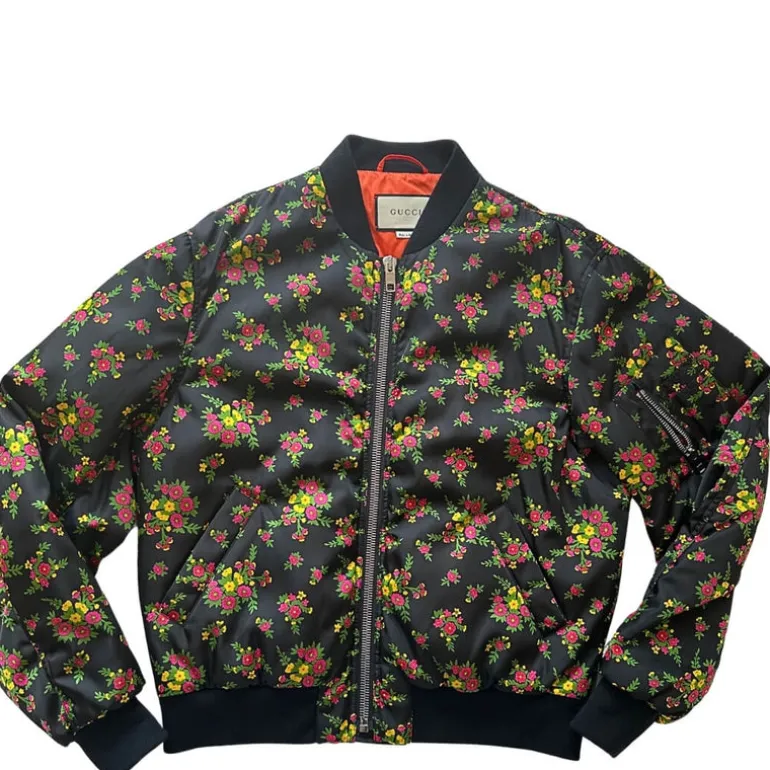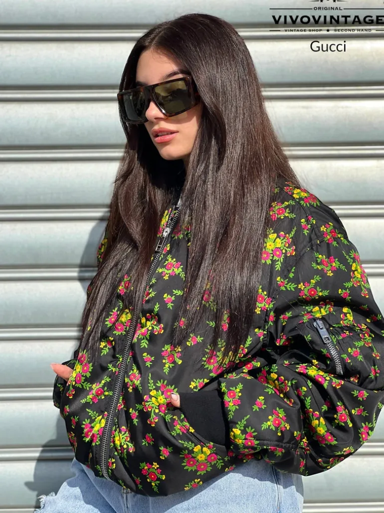 Bomber Gucci in tessuto nero con trama floreale