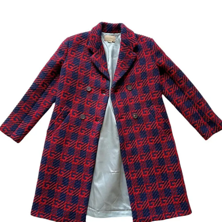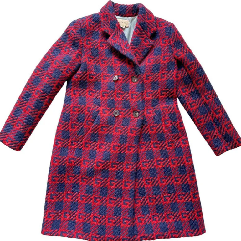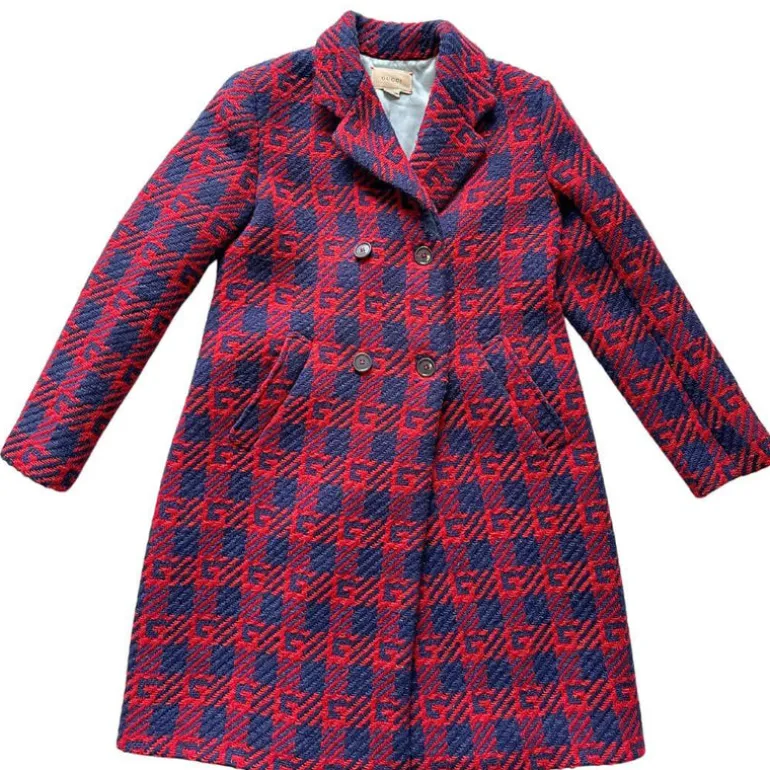 Cappotto Gucci media lunghezza con trama G nella tonalità borgogna e blu. Collezione bambina