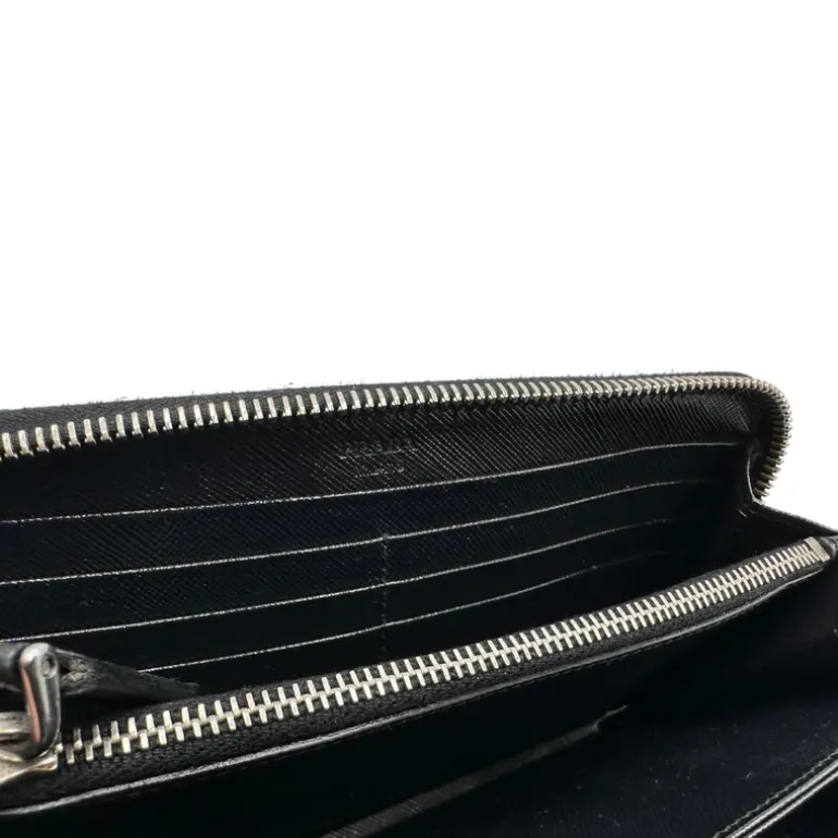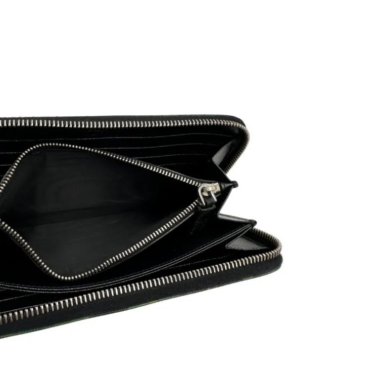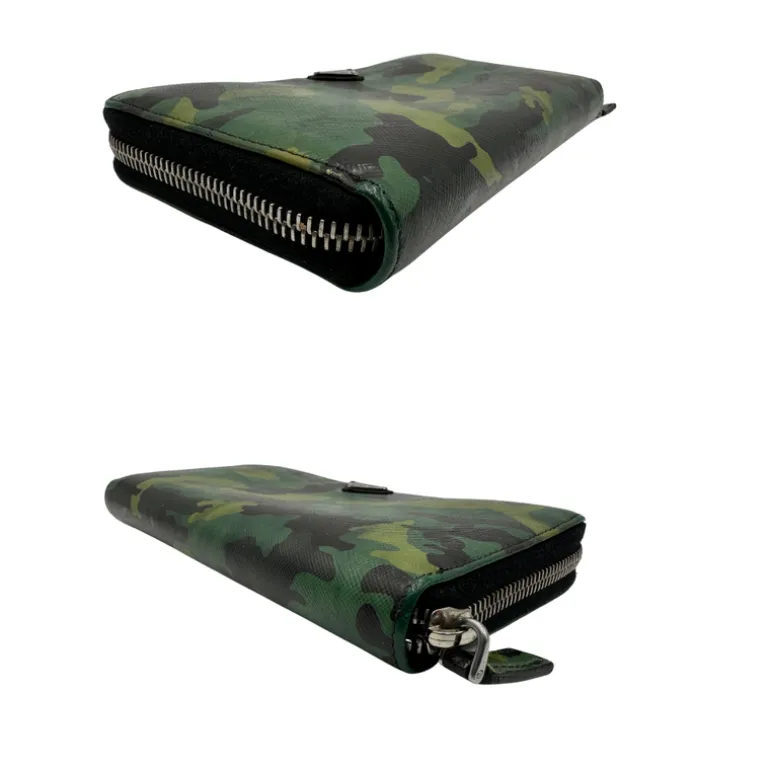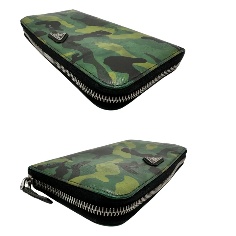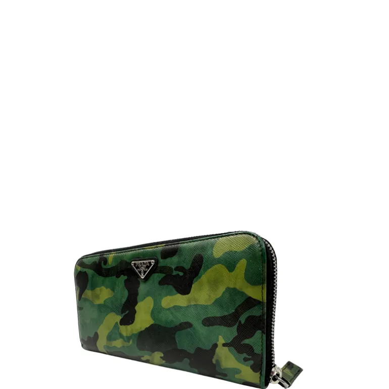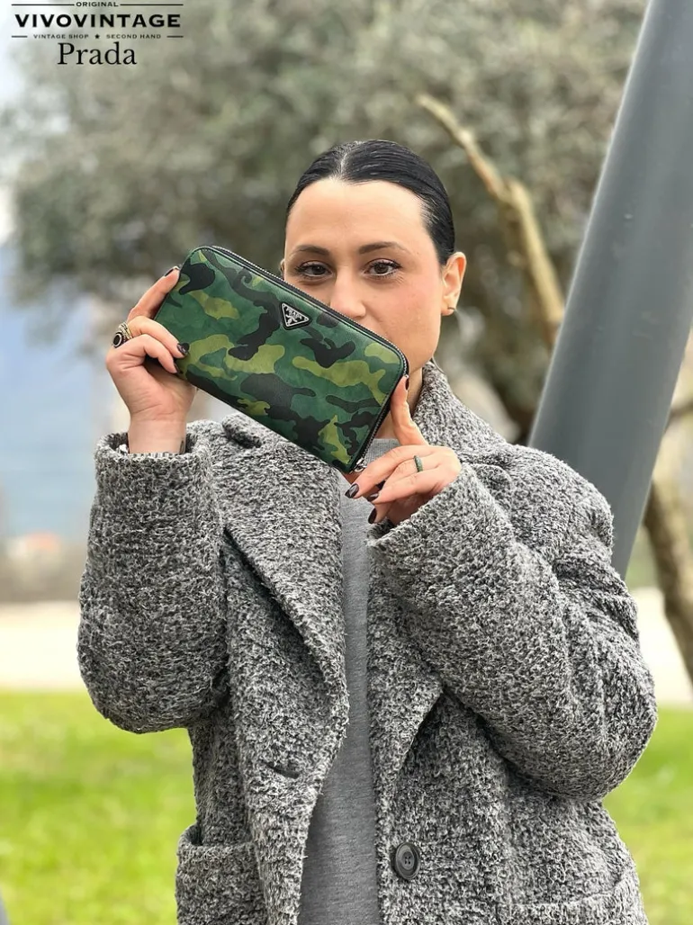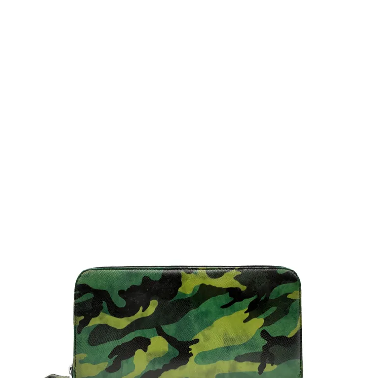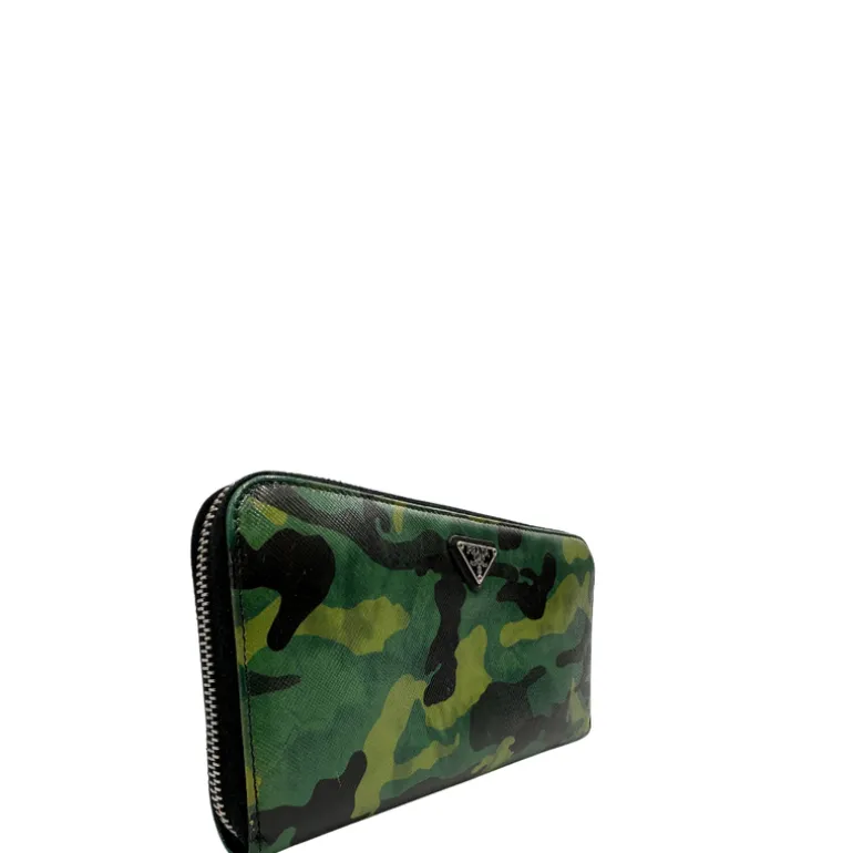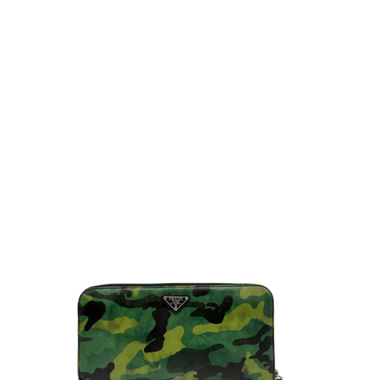Descrizione: Portafoglio Prada in pelle Saffiano camouflage con parti metalliche argentate.